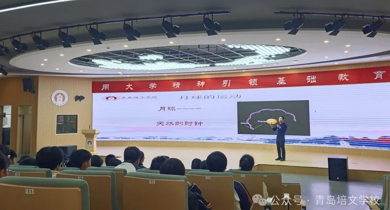 青岛培文学校科学校长、中国科学院理论物理研究所博士、全国物理奥赛金牌教练邵华博士为大家进行题为《论东西》的科普讲座。邵华博士以“一个故事、一个道理、一个礼物”为主线,从大家熟悉的地球经纬度入手,到大航海时代远航者如何判断方向、辨清航线;再到大家熟悉的牛顿第三定律,科学家通过引力和月亮所在的位置判断时间,解答了地理位置上“东西”中奇妙的物理常识。在讲座的最后,邵华博士将自己目前正在编译的牛顿《自然哲学的数学原理》电子版赠送给在座的同学们,寄语大家钻研物理、爱上物理,通过不断努力,为科学强国做出贡献。邵华博士的精彩讲座令在场同学沉浸其中,大家积极发言,掌声雷动。