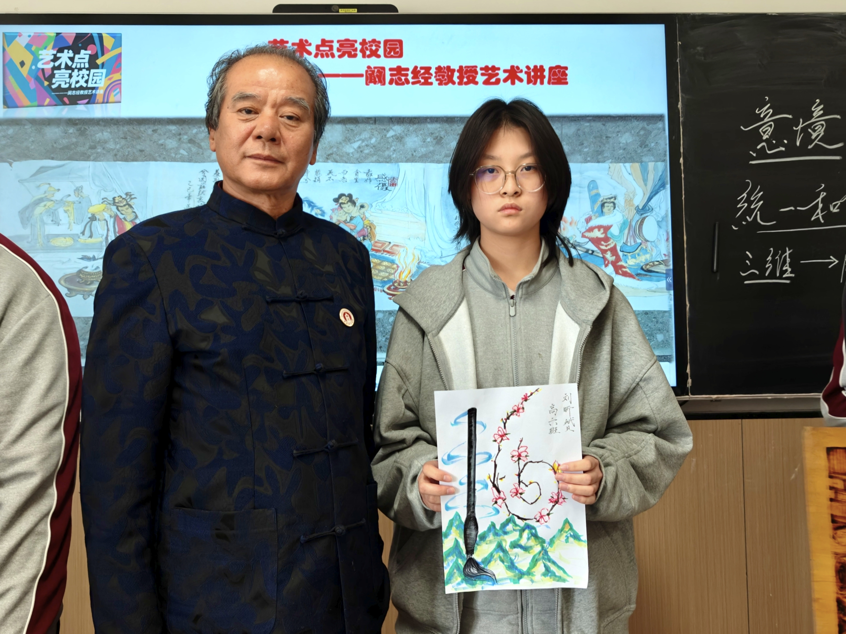 刘昕赟同学代表全体同学为阚教授送上了一幅精心创作的美术作品,表达感激之情。这幅作品不仅凝聚了同学们的心意,也象征着艺术种子在同学们心中生根发芽。