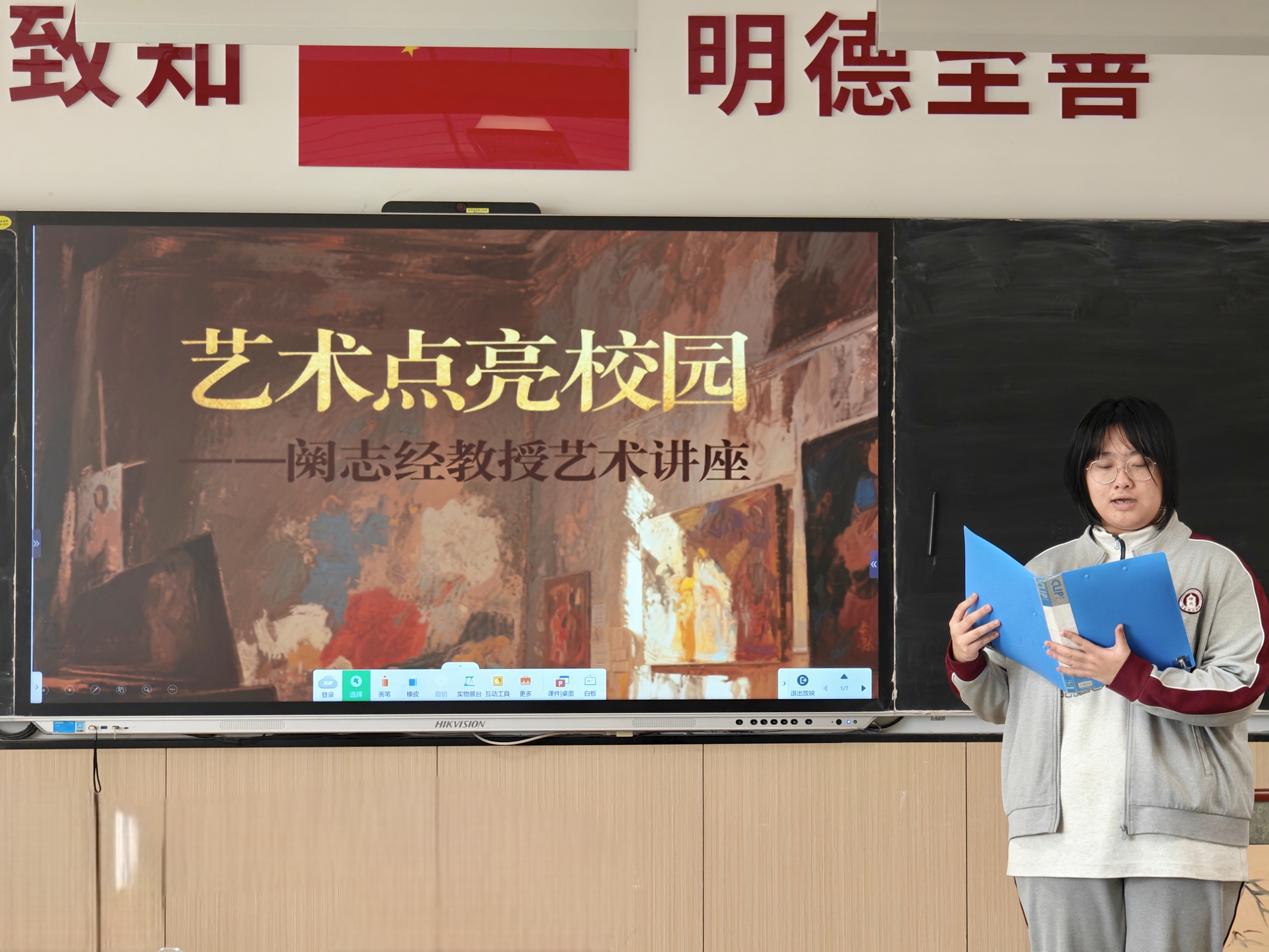 活动伊始,高6班高羽彤同学热情地向大家介绍阚志经教授。她声情并茂地讲述着阚教授在艺术领域的卓越成就和深厚造诣,同学们的目光中满是期待与崇敬。
