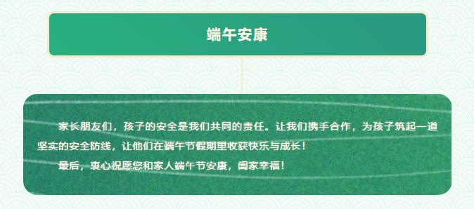 仲夏端午至,粽香满人间。端午,作为中国四大传统节日之一,承载着悠悠千年的华夏文明,是纪念先贤、祈福纳祥的重要时刻,亦是粽叶飘香、龙舟竞渡的欢乐佳节。为了让孩子们能够度过一个平安、祥和、富有意义的端午时光,请各位家长与学校携手做好孩子的安全教育工作,共同为孩子的健康成长筑牢坚实防线。
