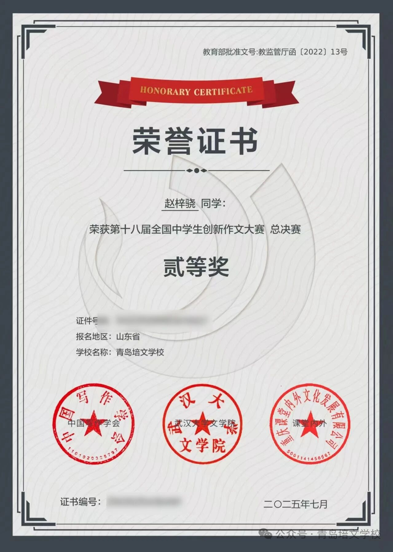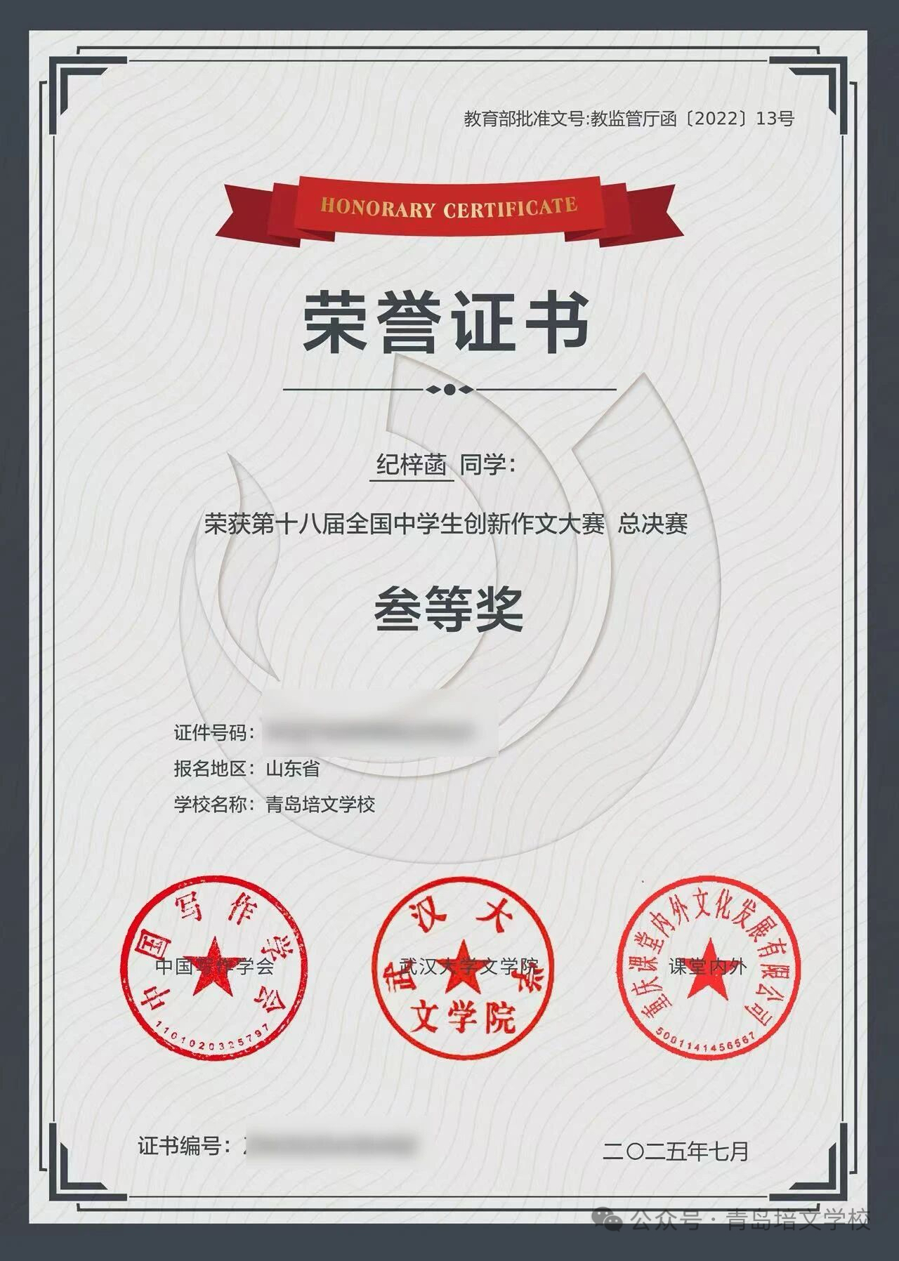 经过青岛市、山东省的层层选拔,我校3名学子成功晋级全国总决赛。面对来自全国的写作精英,他们沉着应战,凭借深厚的文学积淀、敏锐的创新思维和卓越的表达才华,在强手如林的激烈角逐中脱颖而出,全部荣膺国家级奖项!这三位为校争光的优秀学子是: