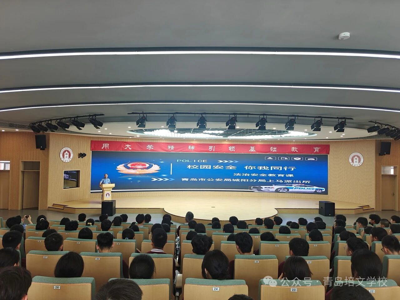 本次讲座特邀我校法治副校长、青岛市公安局城阳分局上马派出所鲍警官主讲。学校校长李新华、行政校长封国出席,教育教学校长王宗强主持本次讲座,全体高一师生共同参与学习。