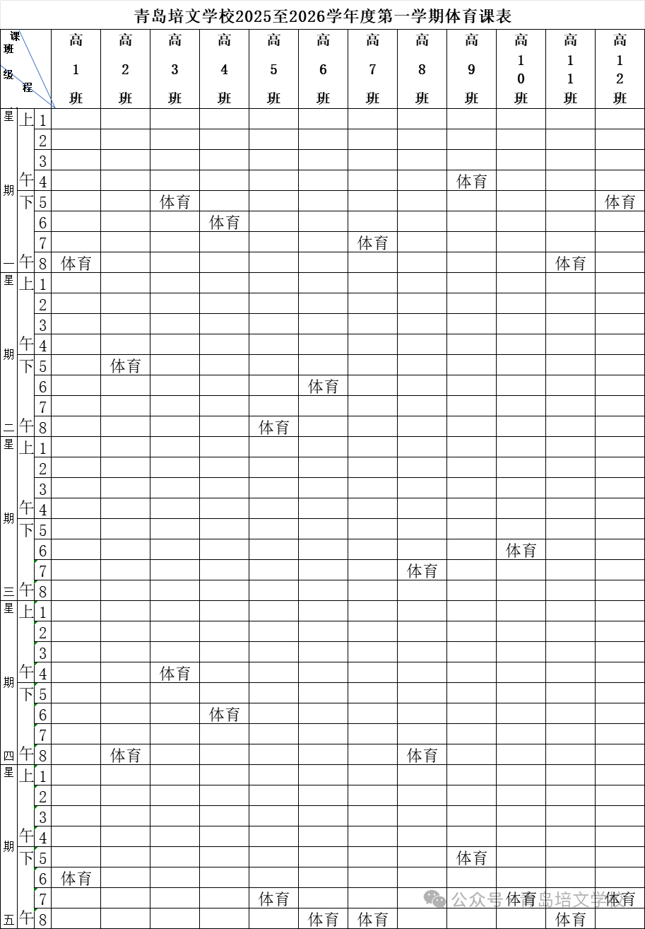 青岛培文学校2025-2026学年第一学期体育课表公示